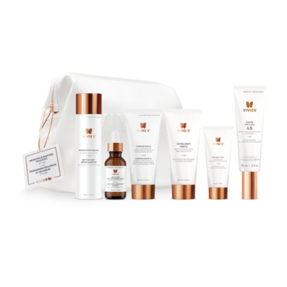 Ce programme d’éclaircissement et de rétablissement comprend une routine complète de produits conçus pour améliorer l’apparence des taches pigmentaires, des ridules, de la texture irrégulière et du teint inégal, tout en protégeant contre les dommages futurs et en retrouvant un éclat naturel et sain